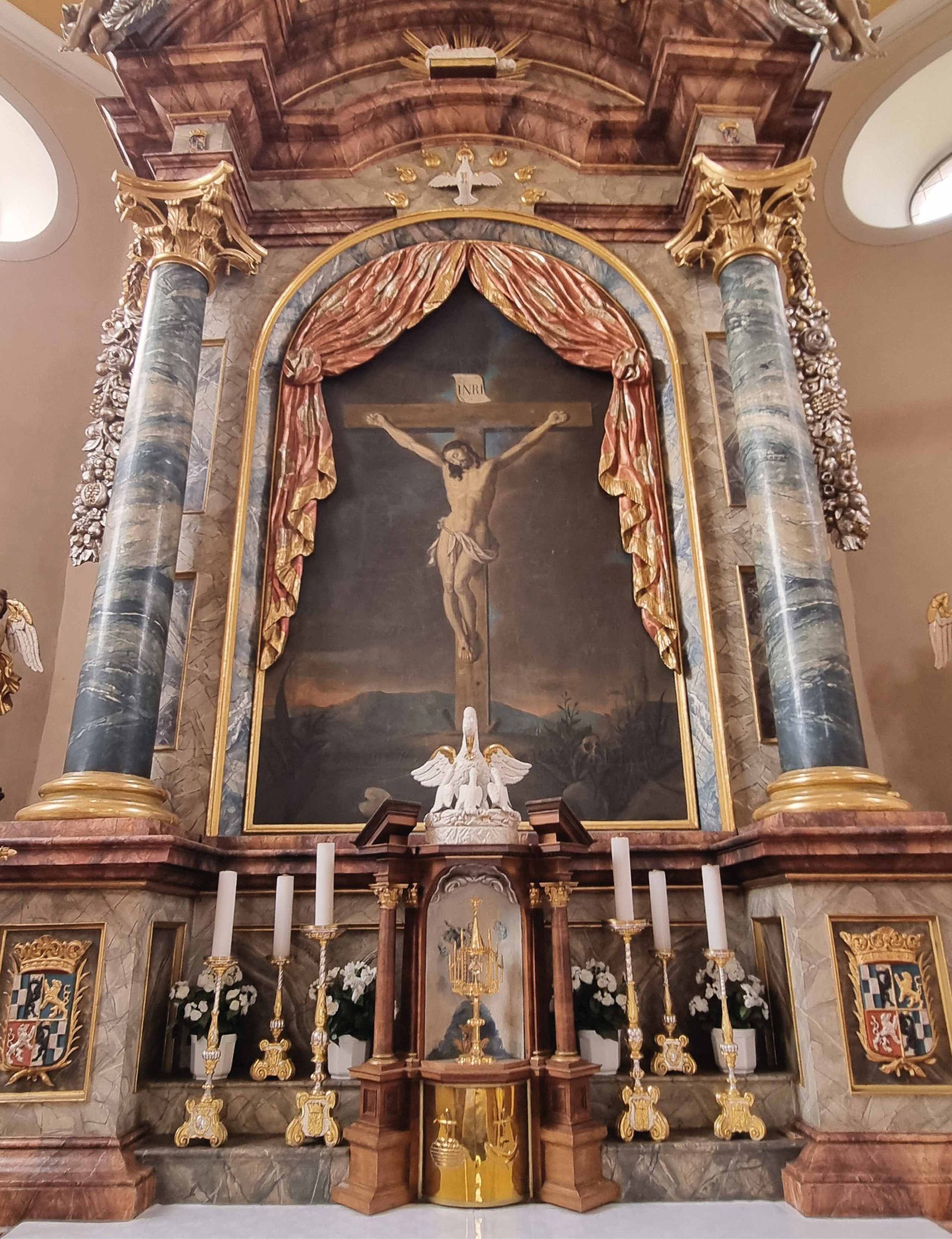 Hauptaltar in der Kirche St. Oswald mit Reliquie über dem Tabernakel