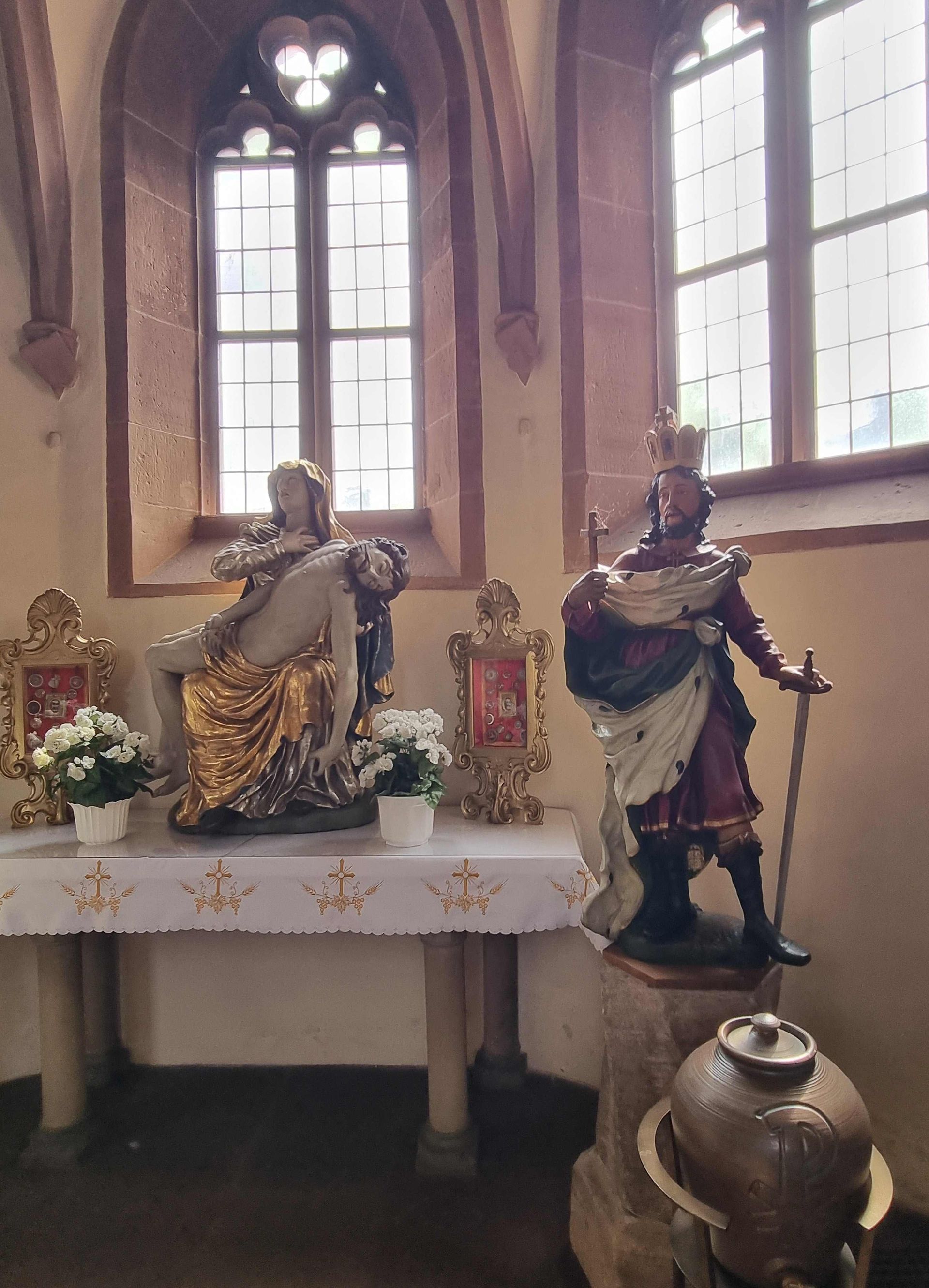 Neben der Pietà und über dem Weihwasserfässchen steht