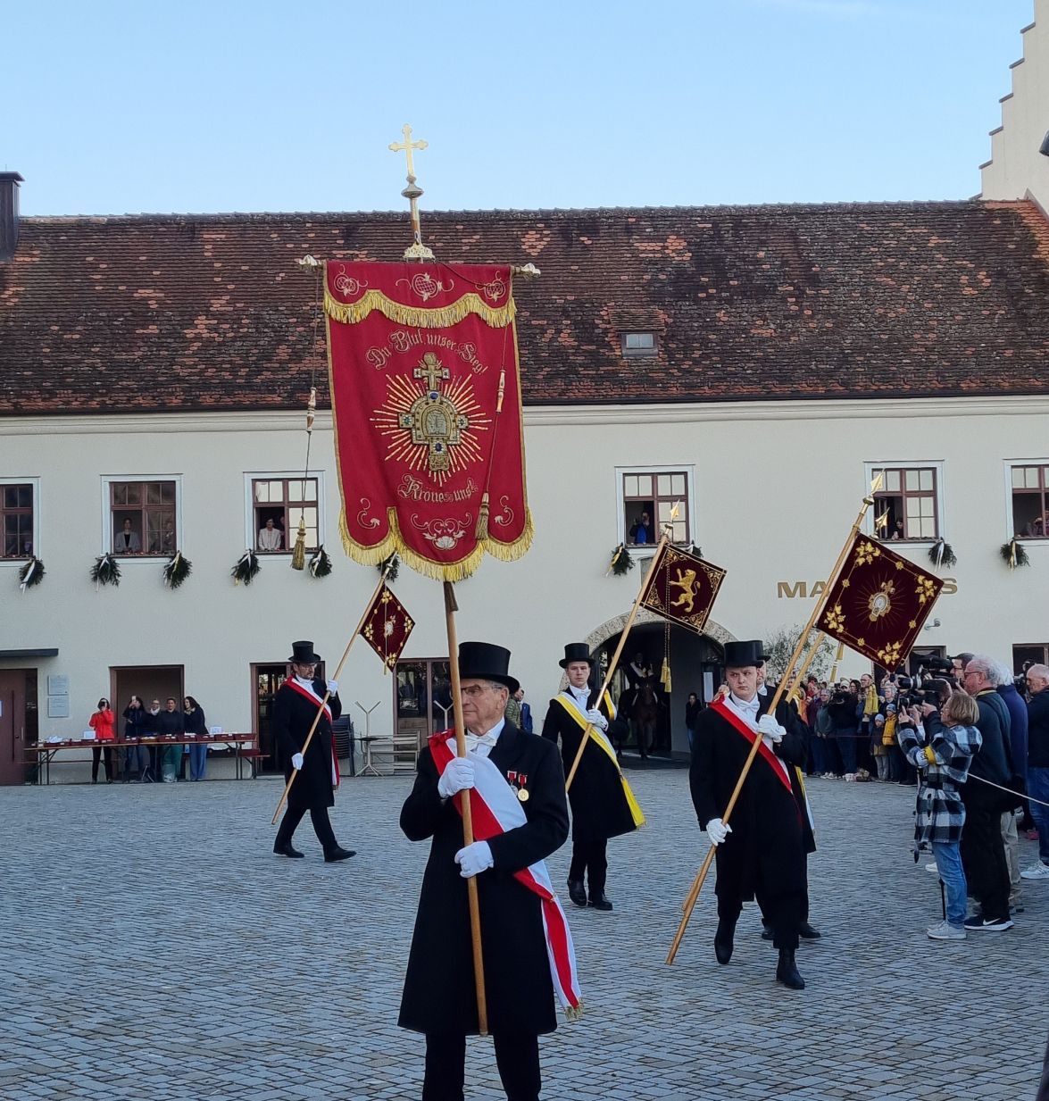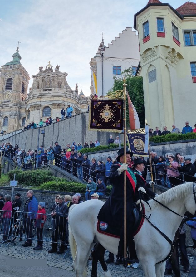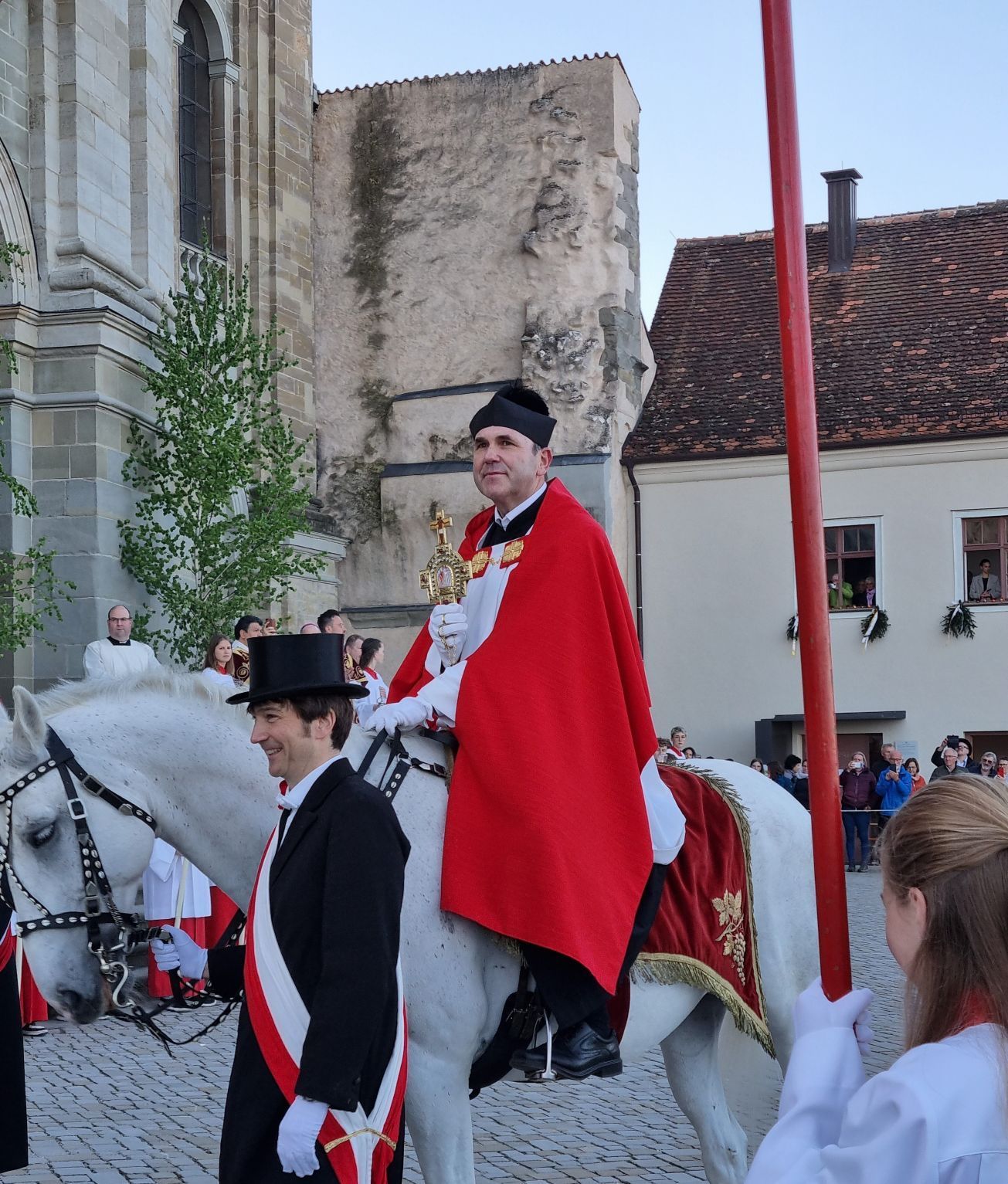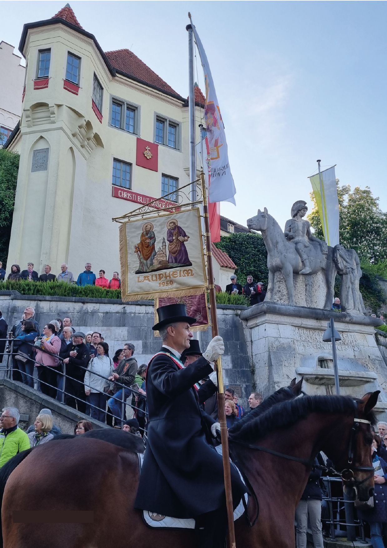 Der Herr Stadtpfarrer trägt die hochverehrte Reliquie des Heiligen Blutes Jesu Christi in seiner Rechten auf einem Schimmel