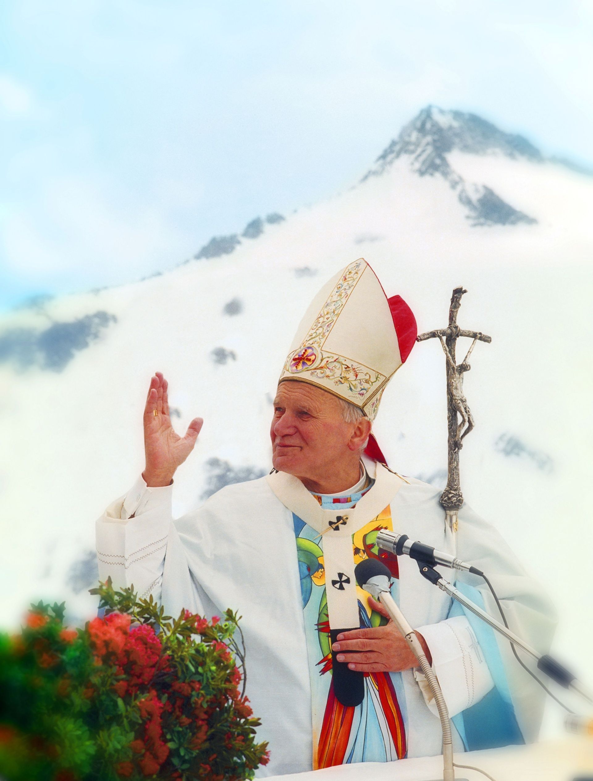 Papst Johannes Paul II. zelebriert die Heilige Messe vor dem Panorama des Adamellogipfels (3554 m) in den Südalpen |