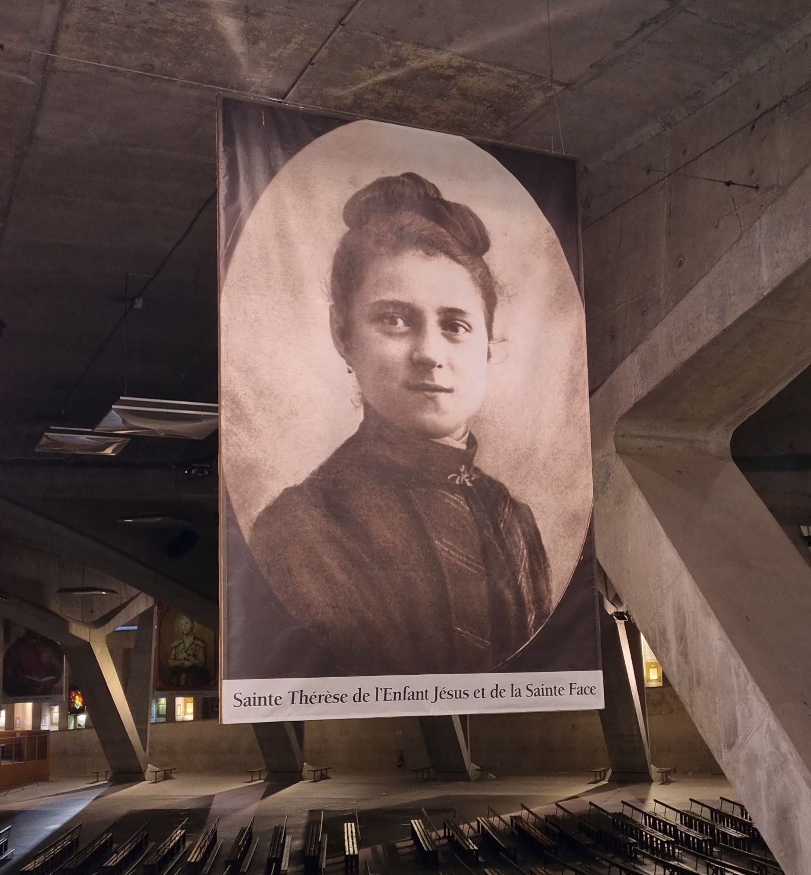 Hl. Theresia v. Kinde Jesus & dem Hl. Antlitz auf einem Banner | Unterkirche St. Pius X. | Lourdes